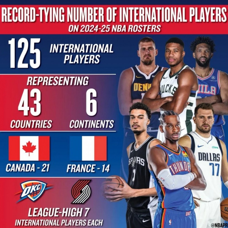 最近几年趋势发生了转向。2017/18赛季,还有2023/24和2024/25赛季,以NBA揭幕战的时间点统计,国际球员的数量都达到了历史最高的125人,占联盟球员数量的1/4了。