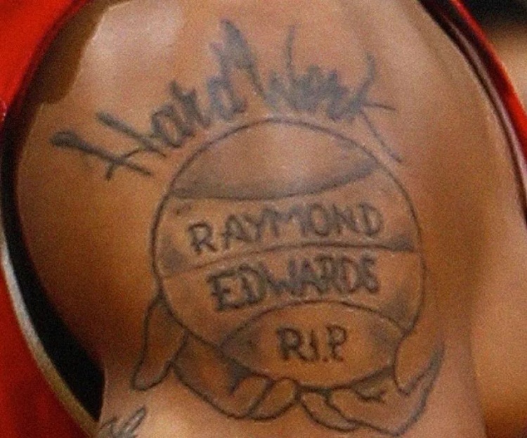 “如果我不打篮球的话,舅舅不会开心的。同时,我要承担起责任,成为一家之主。”他在肩膀上文了一个文身,在一双祈祷的手上,刻着“努力工作”这几个字,双手握着一个篮球,篮球上写着,“雷蒙德-爱德华兹,RIP”,努力工作、祈祷和篮球,这是他和舅舅之间,最牢不可破的纽带。