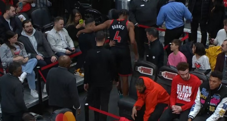 又双伤了!斯科蒂-巴恩斯落地脚尖与莫格博对了一下 崴脚回更衣室