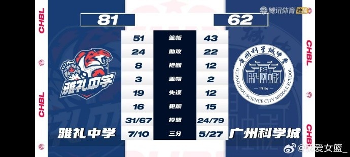 数据方面:雅礼中学胡瑞燕22分8篮板7助攻表现全面,刘瑞16分5篮板,臧欣妍14分10篮板获得两双,徐紫奇14分7篮板。广州科学城艾楚姬空砍23分5篮板,陈木兰12分,李泳霖11分6篮板5助攻。曾鑫雅10分。