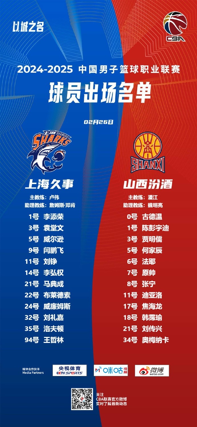 2月26日讯 CBA常规赛,上海将对阵山西。