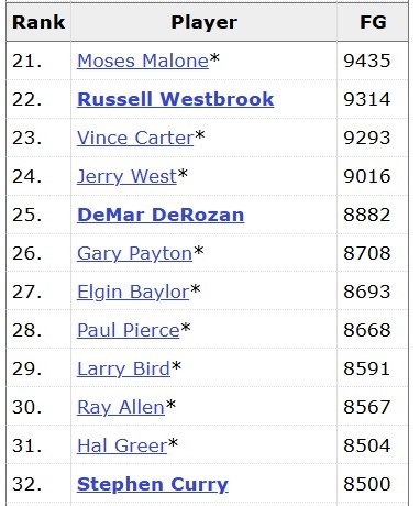 这样一来,库里生涯投篮命中数达到8505个,超越哈尔-格里尔升至历史第31位!