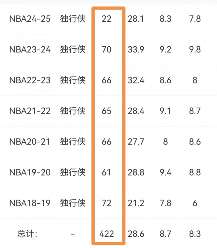 东契奇生涯出勤率并不低。除去本赛季外,东契奇生涯单赛季最多只缺席17场比赛。每个赛季平均出战67场,具体如下: