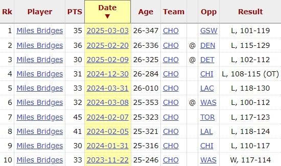值得一提的是,迈尔斯-布里奇斯在过去10场拿到30+的比赛全输了。