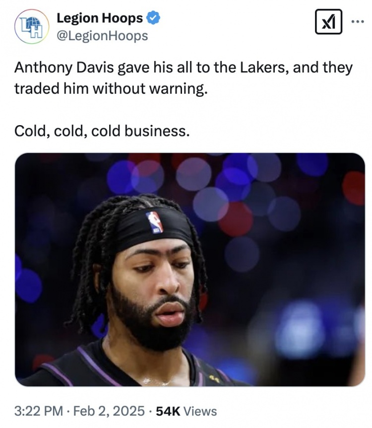 对此,美媒发推表示:“浓眉把一切都献给了湖人,但他们却毫无征兆地把他交易了。这笔交易太让人心寒。”