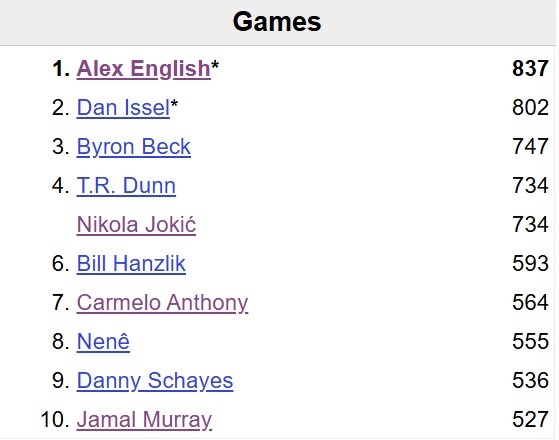 约基奇出战场次超越T.R-邓恩 上升至掘金队史第四位