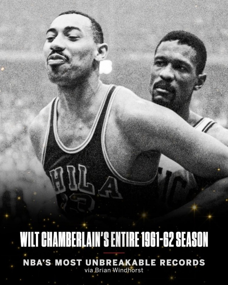 张伯伦的1961-62赛季几乎是用统计数据铸就的传奇,几乎不可能被复制。那个赛季张伯伦场均能得到50.4分,这是NBA历史上的最高纪录,至今无人接近。除了张伯伦之外,只有乔丹曾单赛季场均得分超过37分。此外,张伯伦场均出手39.5次,同样是历史最高,同样无人接近。其他球员连场均出手超过30次的都没有,只有埃尔金-贝勒曾单赛季场均出手29.7次,乔丹和艾弗森各自曾单赛季场均出手27次。