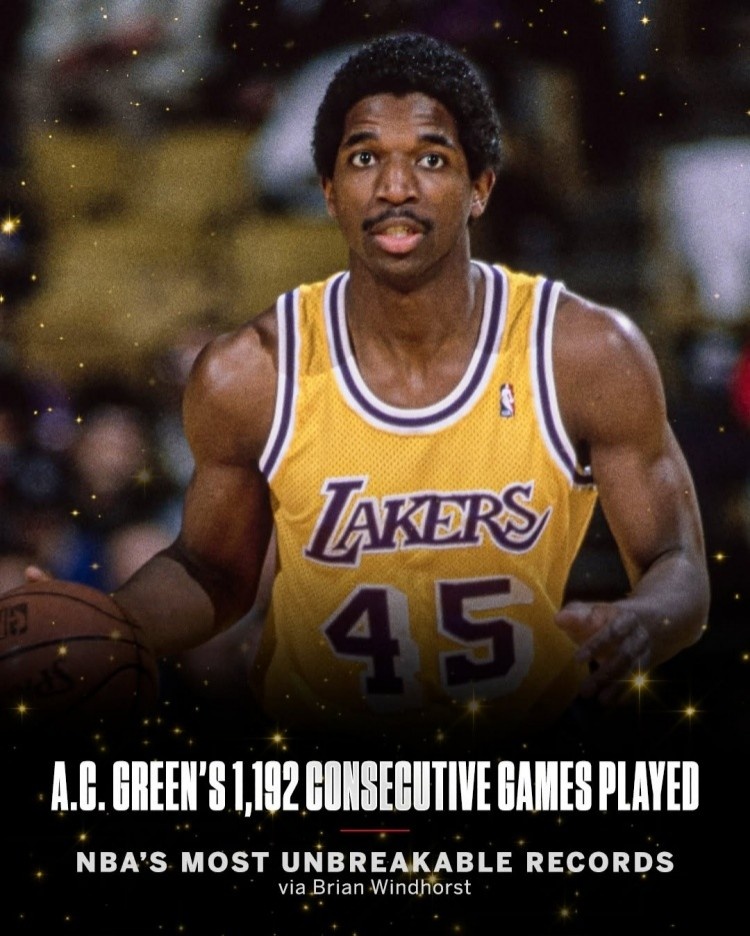 AC-格林从1986年到2001年连续16个赛季保持全勤,期间效力于四支不同的球队。他打破了兰迪-史密斯从1972年到1982年保持的906场连续出场纪录。现年28岁的尼克斯球员米卡尔-布里奇斯职业生涯至今从未缺席过比赛,过去七年连续出场539场。如果他想追上AC-格林的纪录,还需要在未来近八个完整赛季中保持全勤。