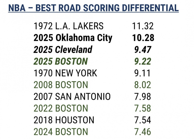 历史单赛季客战场均净胜分榜:72年湖人第一 今年雷骑绿有望冲击