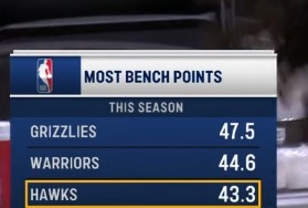 本赛季替补得分前3球队:灰熊47.5分第1 勇士44.6第2 老鹰43.3第3