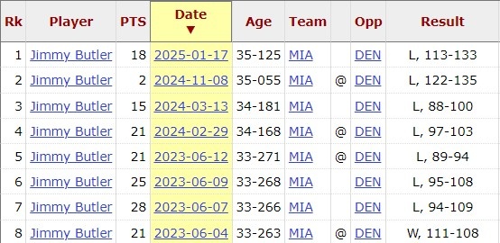 此役告负后,巴特勒个人对掘金是8连败,上次赢球还是2023年总决赛G2。
