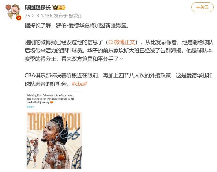 据赵探长了解,罗伯-爱德华兹将加盟新疆男篮。