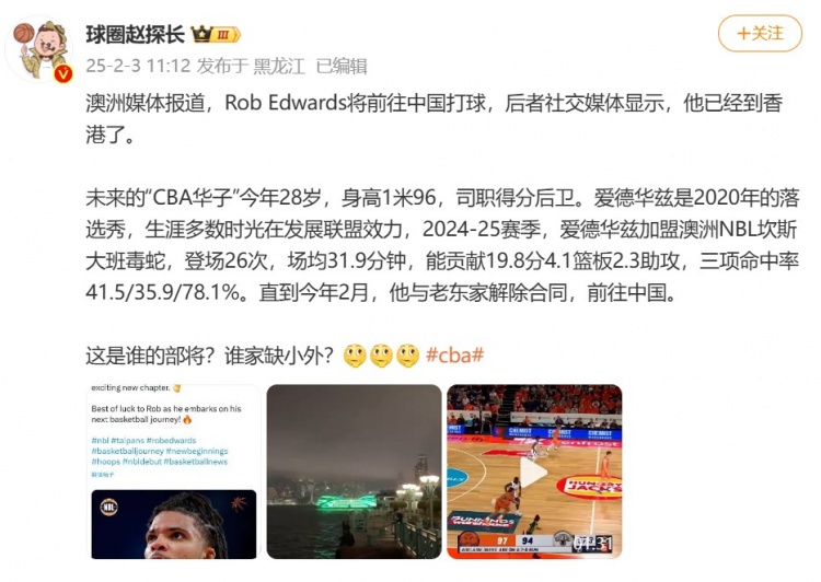 2月3日讯 今日,据媒体人球圈赵探长透露,澳洲媒体报道,罗伯-爱德华兹(Rob Edwards)将来中国打球,后者社交媒体显示,他已经到香港了。