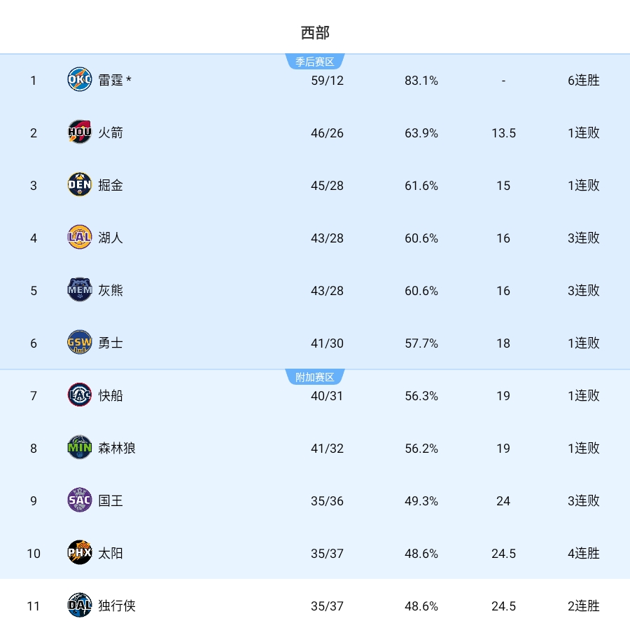 本场比赛过后,太阳取得4连胜,战绩来到35胜37负,凭借交手战绩(3-1)超越独行侠,升至西部第十,闯进了附加赛区域!