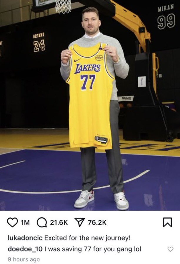 随后到了昨天,东契奇晒出了自己手持湖人球衣的图片,芬尼-史密斯在其底下评论:兄弟,77号是我留着给你来穿的,哈哈哈。