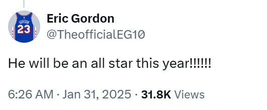 对此,76人老将、前火箭队友埃里克-戈登评论道:“他本赛季将会进入全明星的!!!!”