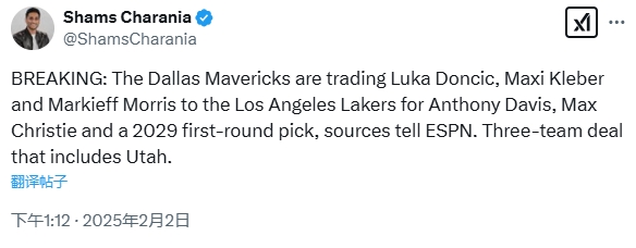 浓眉与东契奇互换?美记震惊:Shams被盗号了? 02月02日讯 Shams爆料,三方交易,东契奇被交易至湖人,浓眉去到独行侠。记者Jay King震惊:“Shams被盗号了吗?真的?我的发!” 2025/02/02