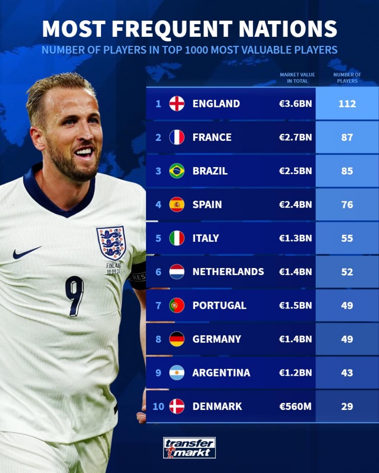 德转身价前1000各国球员人数:英格兰112人最多,法国87人次席