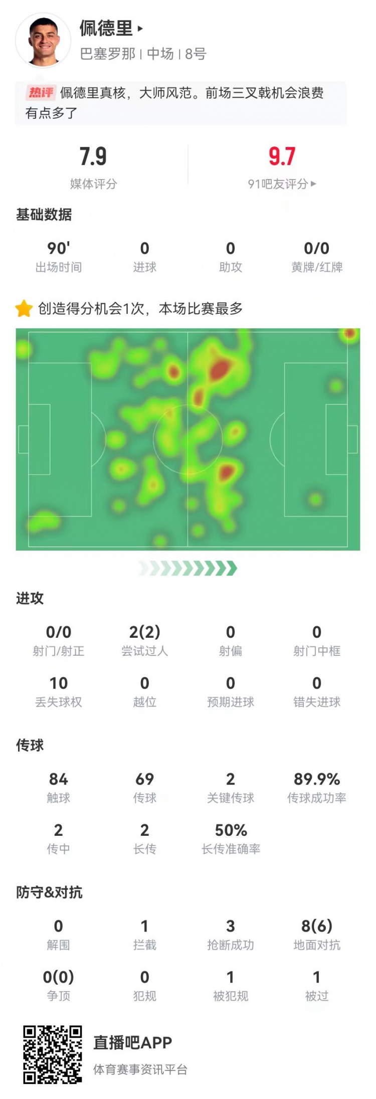 官方:佩德里当选MVP,2关键传球1造良机 7对抗5成功 7.9分最高