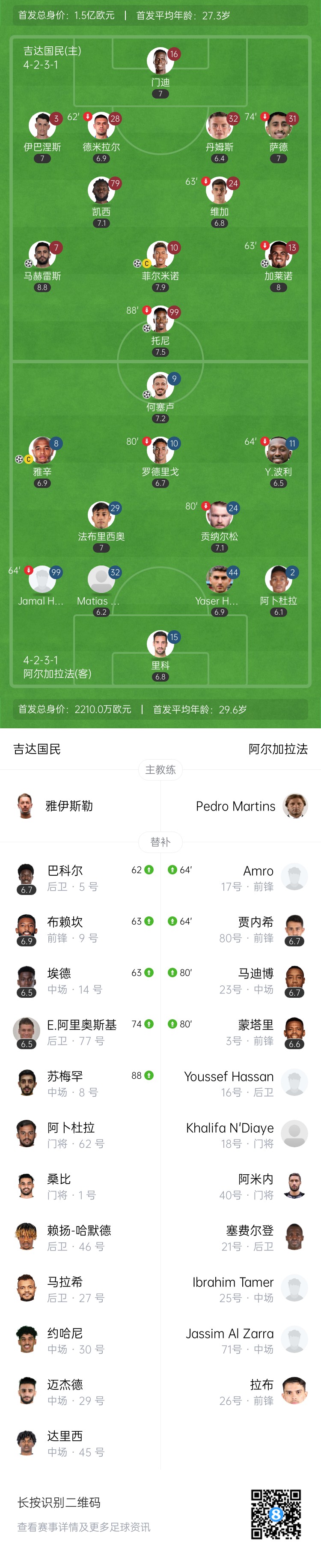02月18日讯 在昨晚结束的亚冠精英联赛西亚区最后一轮中,沙特球队吉达国民4-2击败卡塔尔球队加拉法,双方分别首发10外援。吉达国民的首发总身价更是达到了1.5亿欧。