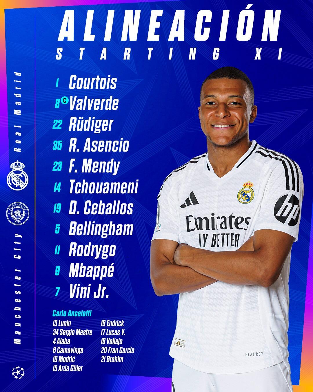 皇马替补:13-卢宁、34-梅斯特雷、4-阿拉巴、6-卡马文加、10-莫德里奇、15-居勒尔、16-恩德里克、17-巴斯克斯、18-巴列霍、20-弗兰-加西亚、21-迪亚斯