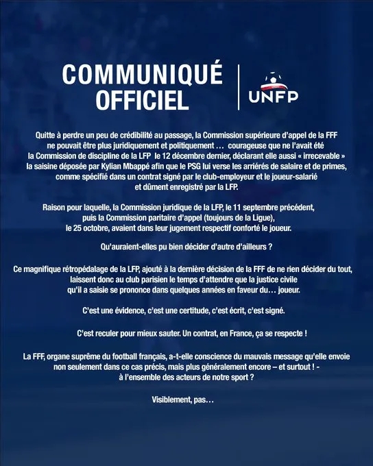 法国职业球员工会发表官方公告,严厉批评法国足协上诉委员会延续法国职业联盟纪律委员会去年的决定,前者对姆巴佩和巴黎的薪资纠纷案“不予受理”。