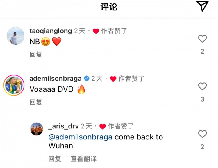曾经在武汉三镇并肩作战的陶强龙、埃德米尔森,都留言为戴维森送上了祝福。