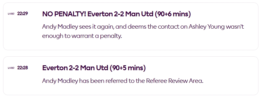 英超官方比赛中心随后给出了更为官方的说法,VAR检查了裁判给埃弗顿的点球判罚,认为马奎尔对阿什利杨并没有犯规,建议主裁对回放进行审查。主裁判最终推翻了原有判罚,并以间接任意球重新开始比赛。