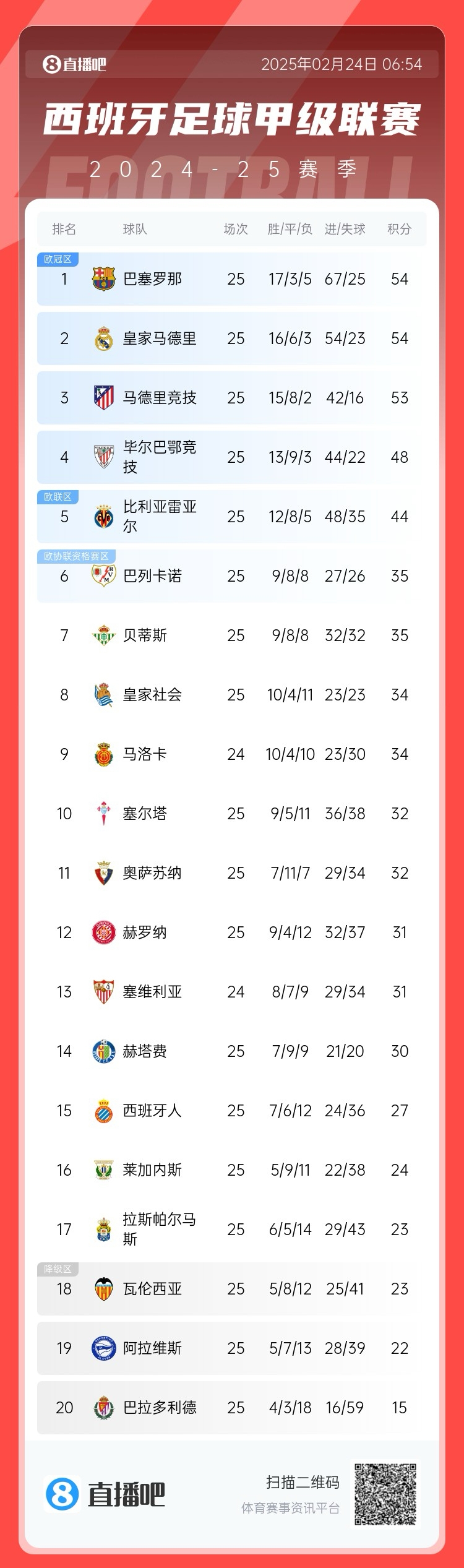 西甲积分榜:巴萨榜首,与皇马同分、只领先马竞1分。