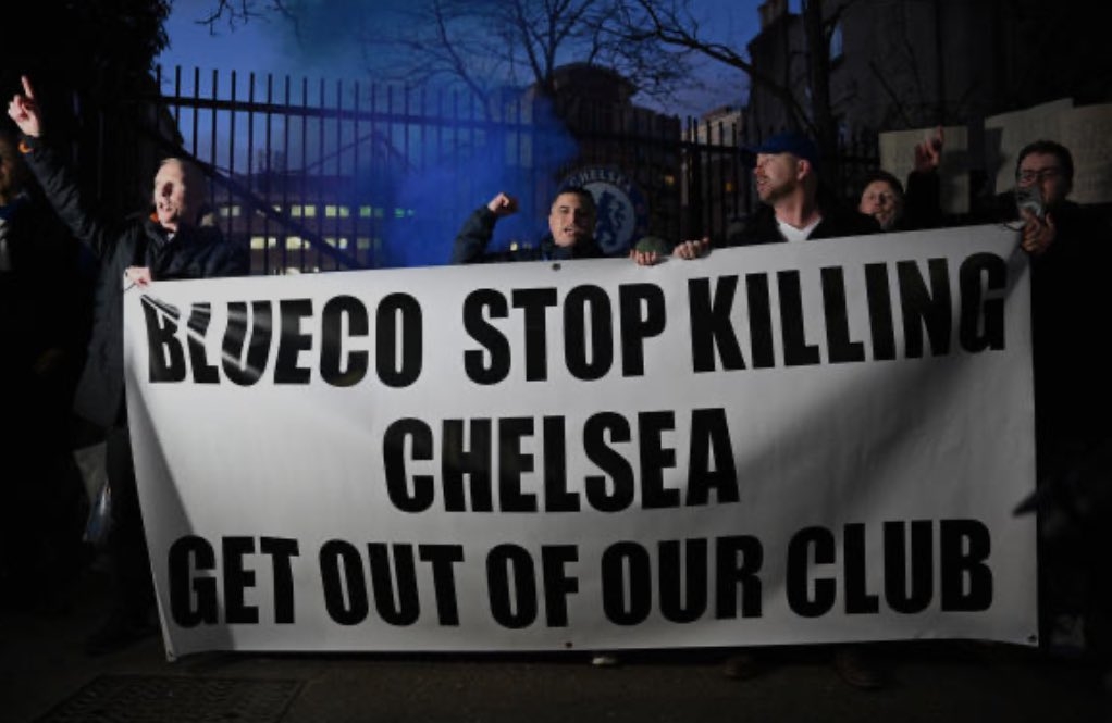在比赛开始前,数百名切尔西球迷在斯坦福桥场外举行了抗议活动,对切尔西老板伯利和清湖资本。