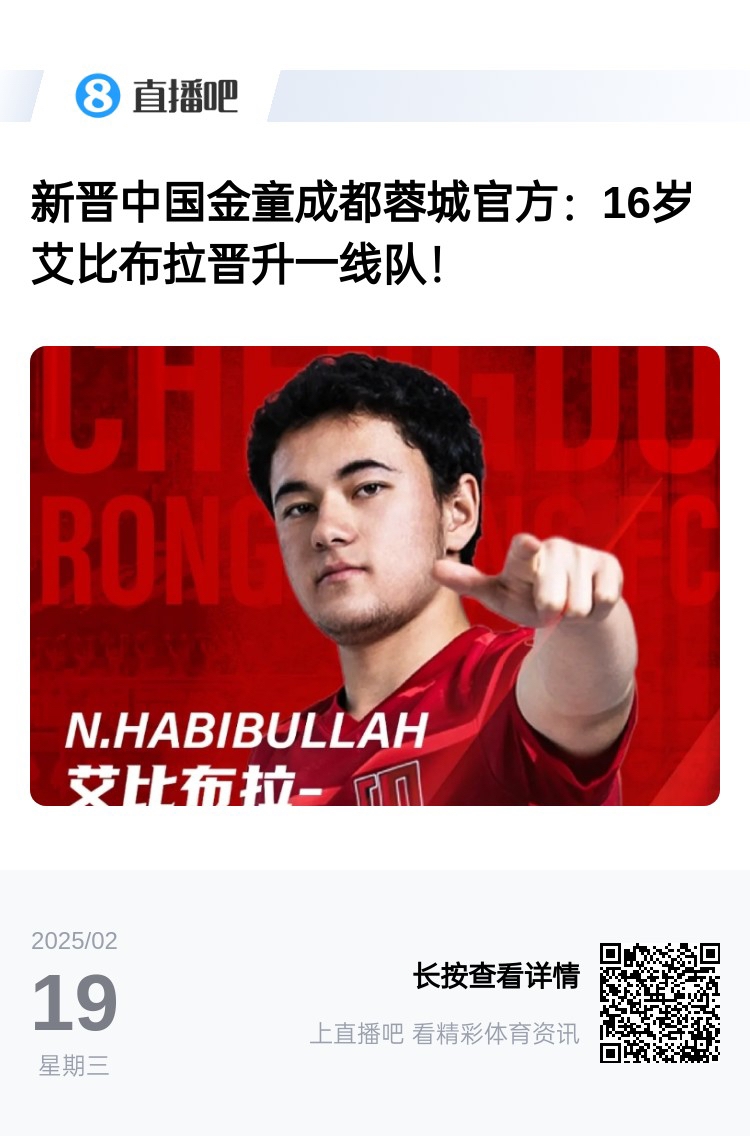 U17国足阵中,艾比布拉同样被提拔至成都蓉城一线队,今晚蓉城对阵津门虎,16岁的艾比布拉能否上演中超首秀?