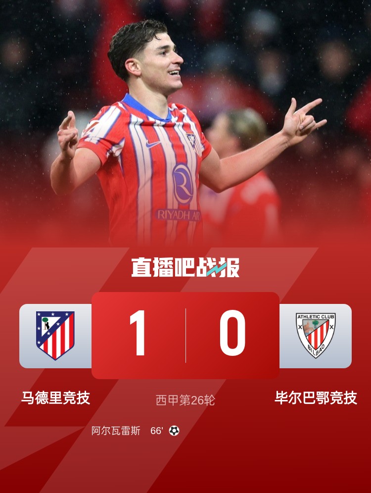 本轮西甲,马竞1-0击败毕巴,阿尔瓦雷斯攻入全场唯一进球。此役后,马竞先赛登顶。