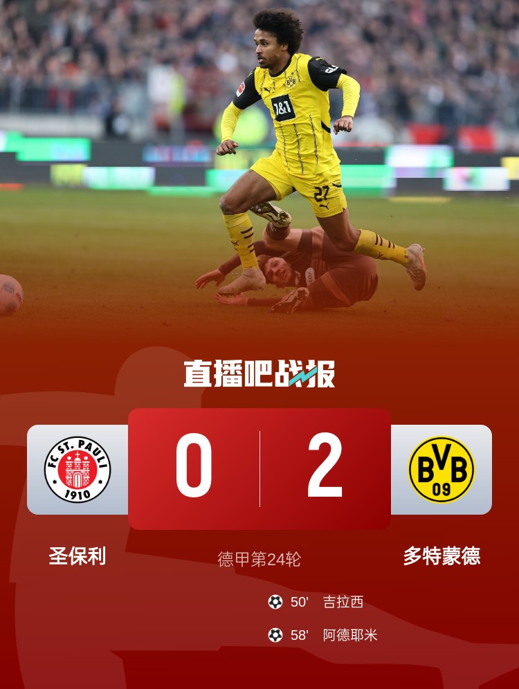 多特本轮2-0击败圣保利,吉拉西、阿德耶米的进球为多特拿下3分。