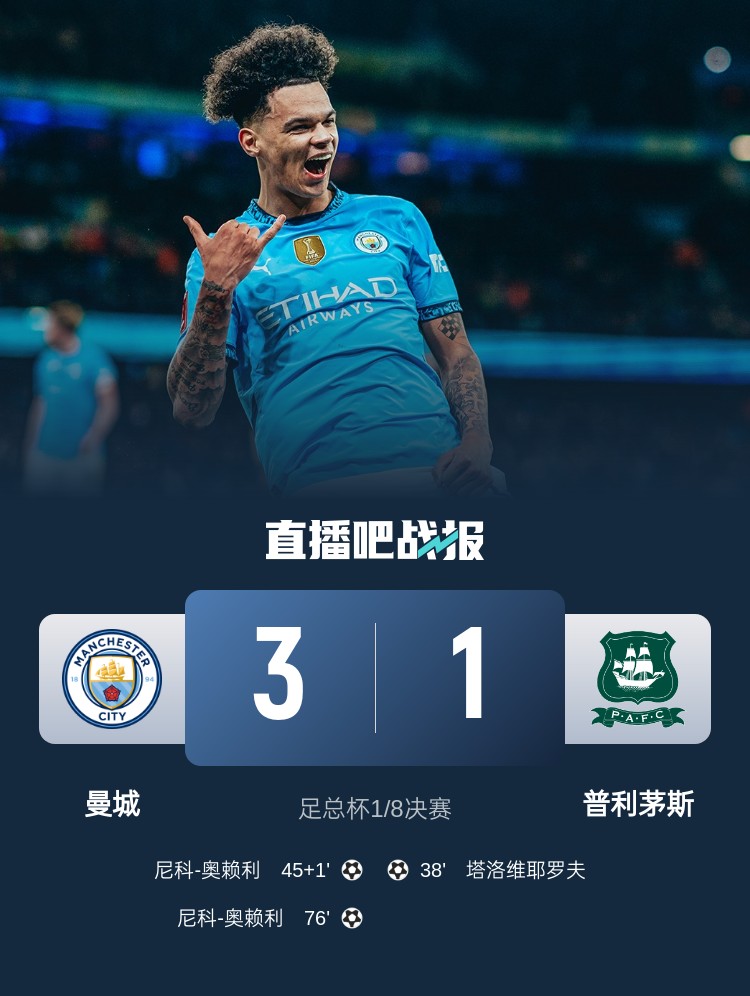 曼城足总杯3-1击败普利茅斯,奥赖利双响建功,丁丁传射。