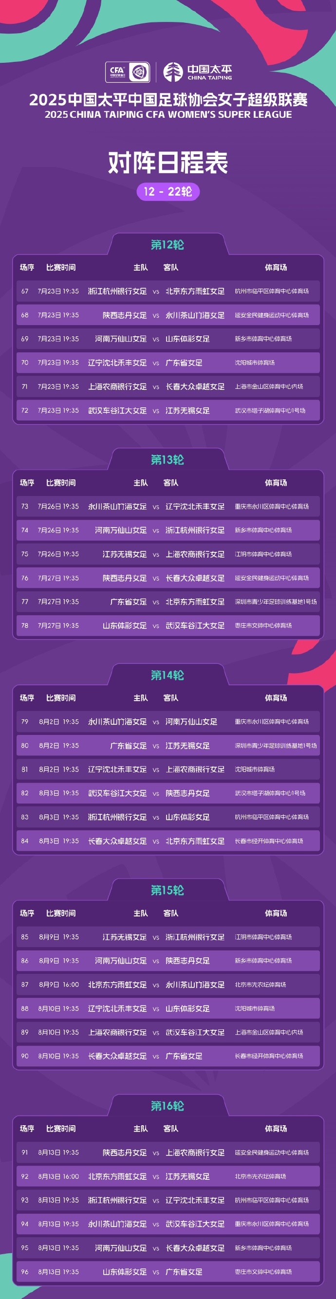 2025中国太平中国足球协会女子超级联赛对阵日程表