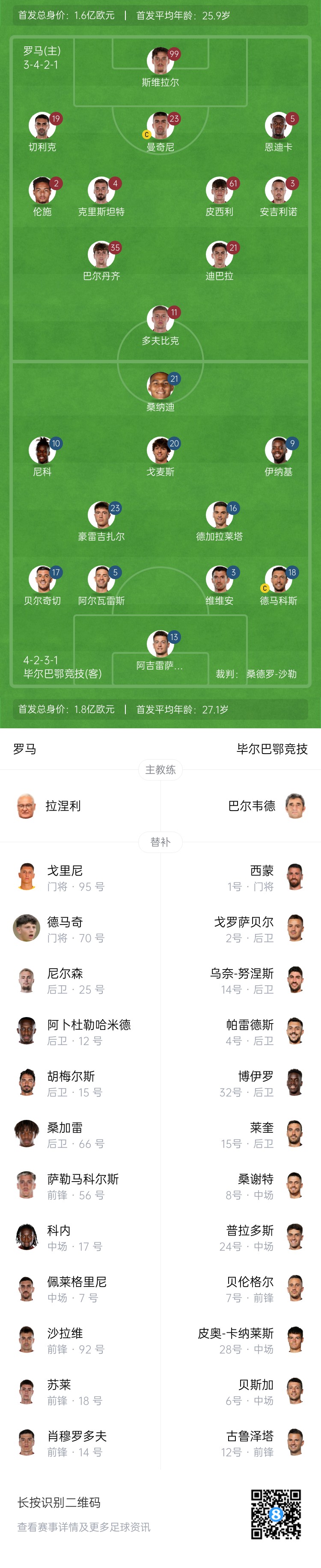 罗马首发:99-斯维拉尔、19-切利克、23-G-曼奇尼、5-恩迪卡、2-伦施、61-皮西利、4-克里斯坦特、3-安吉利诺、21-迪巴拉、35-巴尔丹齐、11-多夫比克