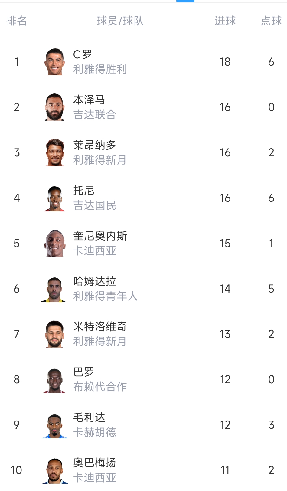 最新沙特联射手榜,C罗18球领跑,本泽马、莱昂纳多、托尼16球并列第二,奥巴梅扬11球第十。