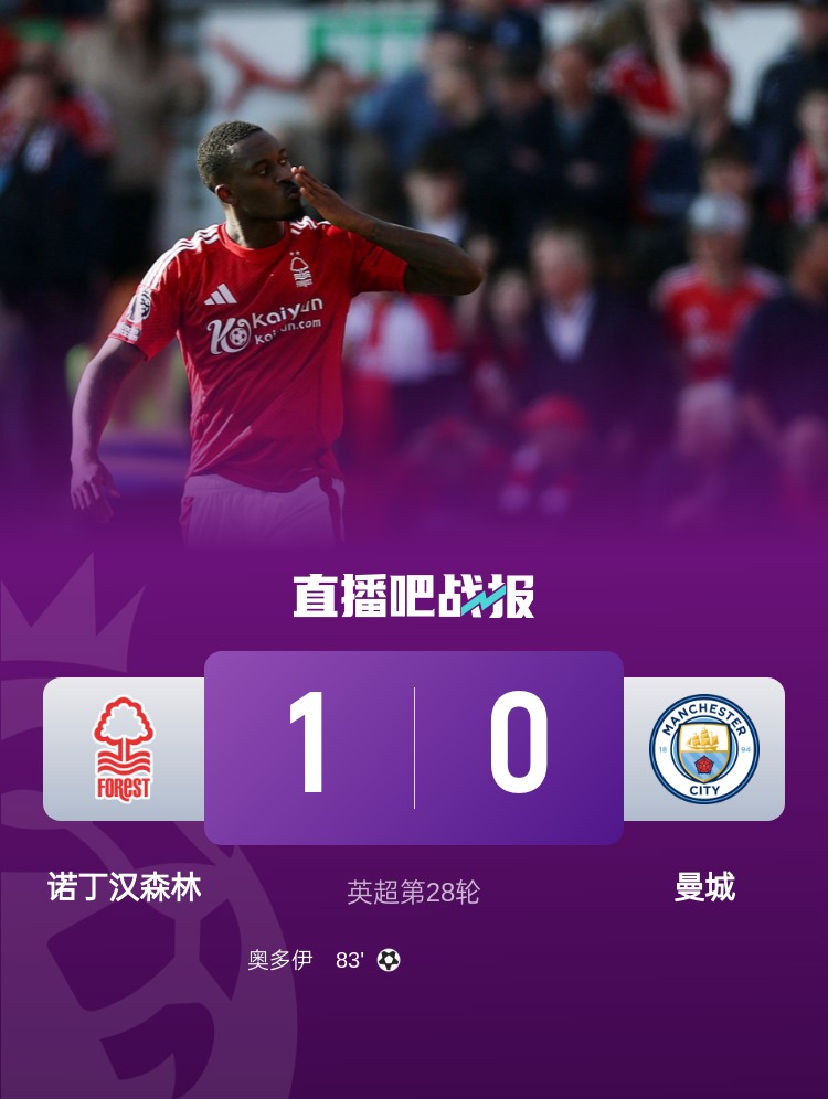 遭绝杀! 曼城0-1森林先赛仍第4 森林终结对曼城三连败奥多伊制胜