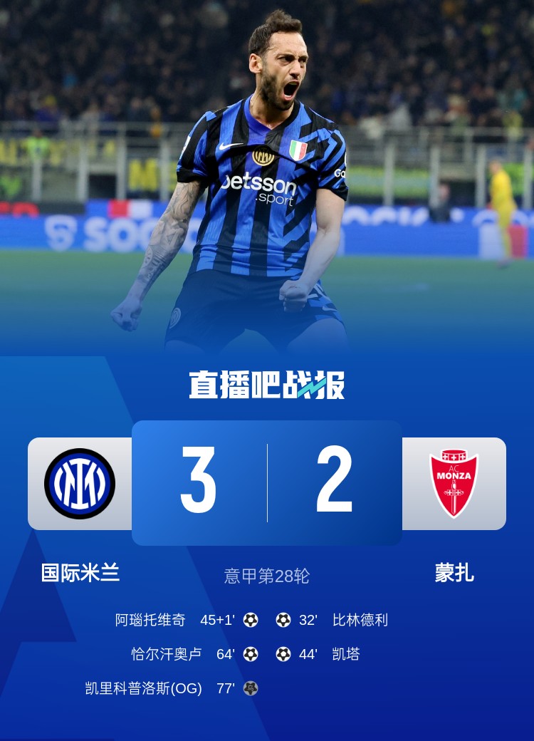 意甲第28轮,国米3-2逆转蒙扎。上半场,劳塔罗破门被吹无效,图拉精彩扑救,比林德利首开记录,凯塔远射世界波,阿瑙托维奇扳回一城;下半场,恰尔汉奥卢凌空抽射扳平,劳塔罗头球造乌龙,小图拉姆推射中柱。