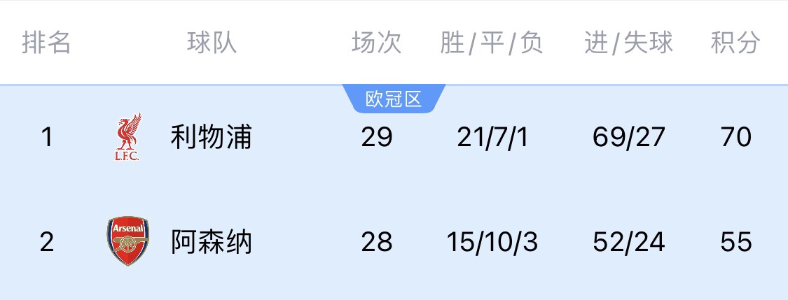 如果利物浦赢得接下来的两场比赛,拿到76分;而阿森纳恰好四连败,即4月13日21:00利物浦主场迎战西汉姆之前,红军已提前锁定冠军。