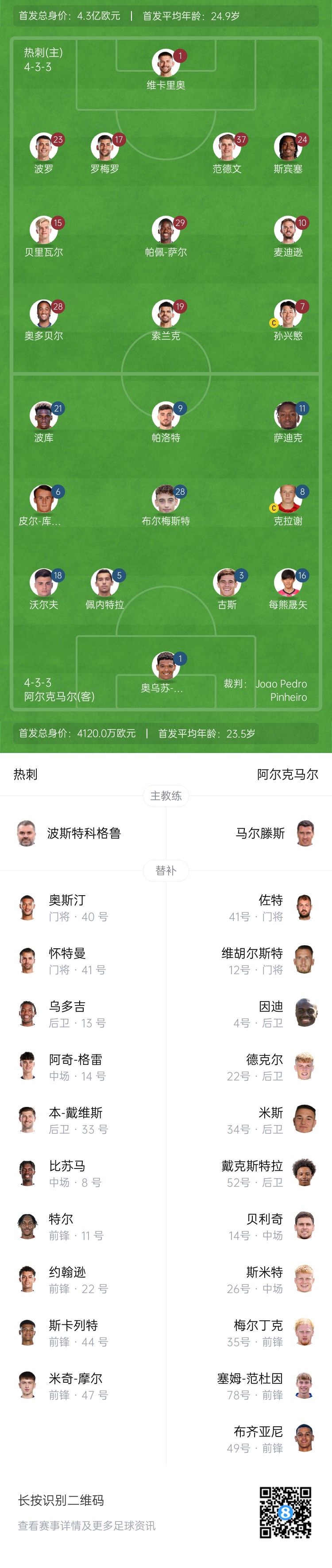 热刺首发:1-维卡里奥、23-波罗、17-罗梅罗、37-范德文、24-斯宾塞、10-麦迪逊、15-贝里瓦尔、29-帕佩-萨尔、28-奥多贝尔、19-索兰克、7-孙兴慜