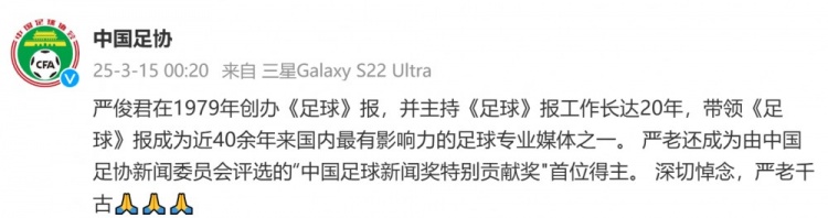 中国足协发文悼念《足球》报创刊人严俊君:深切悼念,严老千古