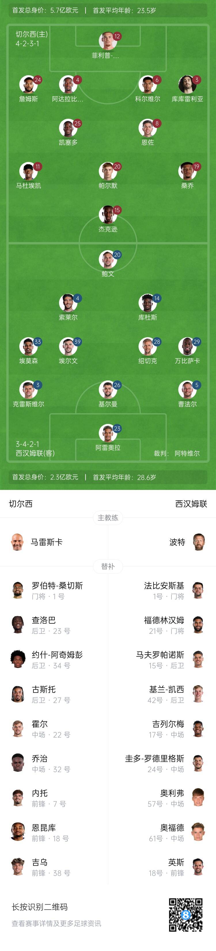 切尔西首发:12-约根森、24-里斯-詹姆斯、4-阿达拉比奥尤、6-科尔维尔、3-库库雷利亚、25-凯塞多、8-恩佐、11-马杜埃凯、20-帕尔默、19-桑乔、15-杰克逊