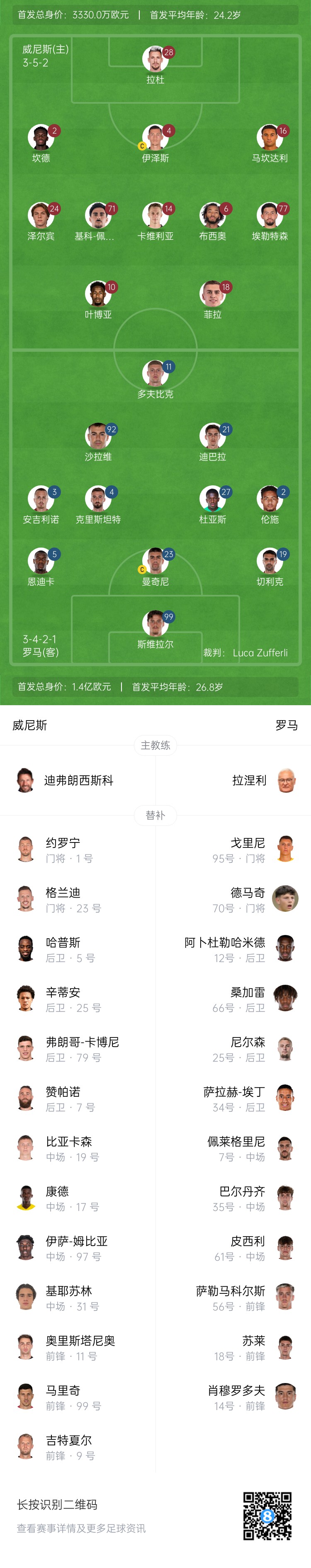 威尼斯首发:28-拉杜、16-马坎达利、4-埃泽斯、2-坎德、71-基科-佩雷斯、14-卡维利亚、6-布西奥、24-泽尔宾、77-埃勒特森、18-菲拉、10-耶博阿