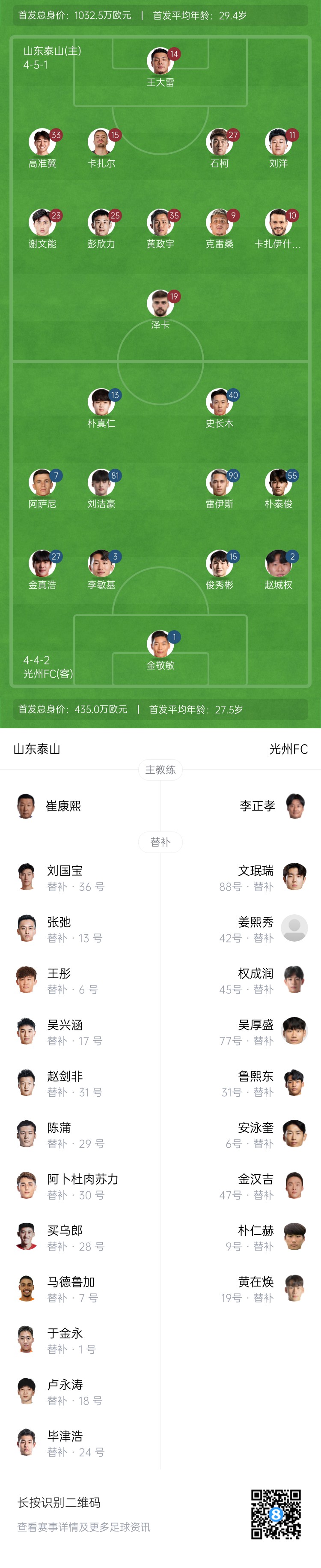 泰山vs光州首发:4外援PK2外援,卡扎尔首秀,谢文能、石柯出战