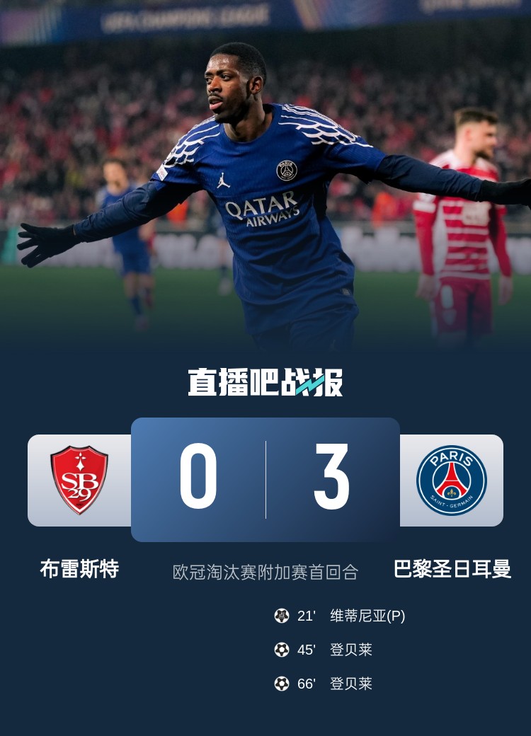 欧冠-巴黎3-0布雷斯特占先机 登贝莱双响+造点&8场轰15球