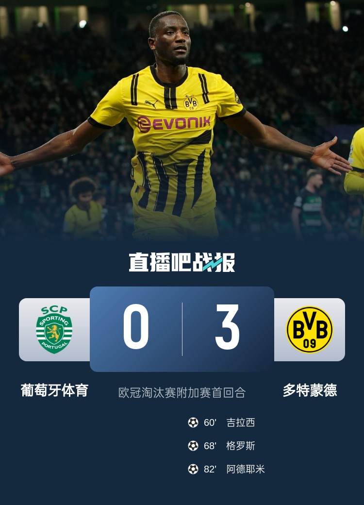 吉拉西、阿德耶米破门,多特蒙德客场3-0击败葡萄牙体育。