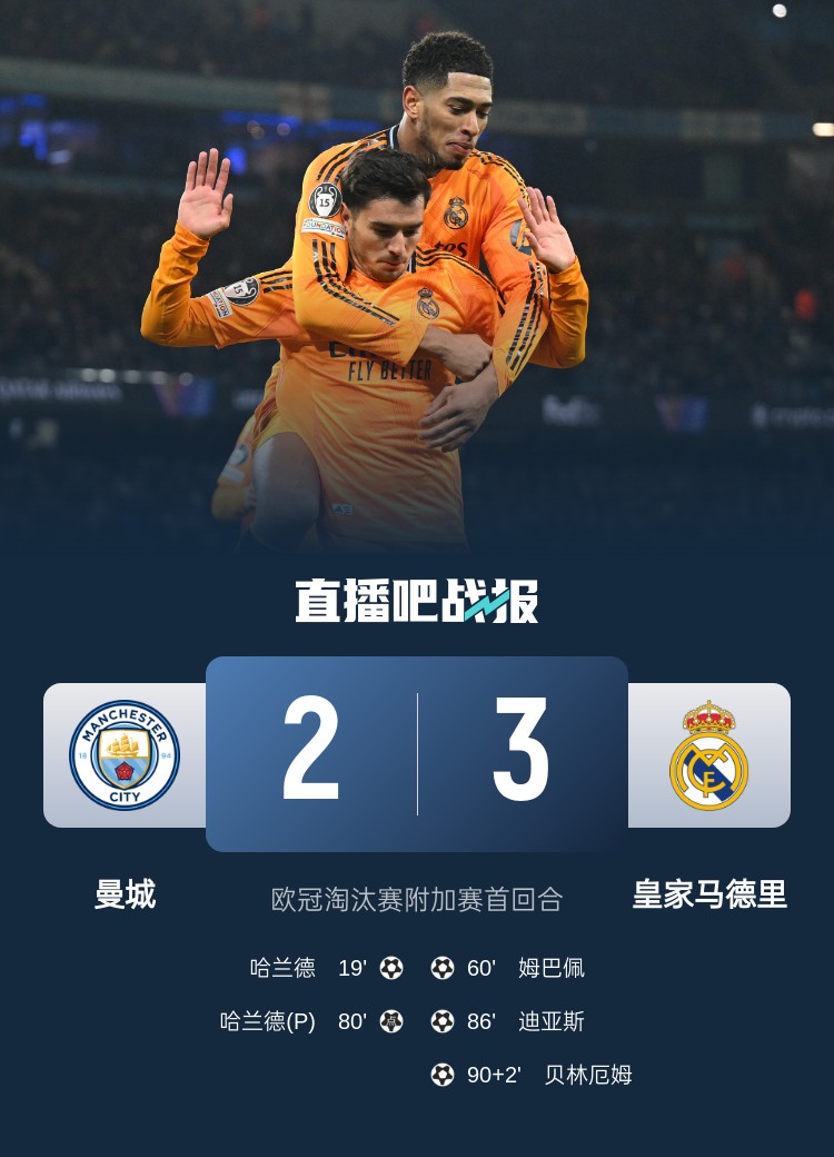 哈兰德双响,贝林厄姆绝杀,皇马3-2曼城,占据先机。
