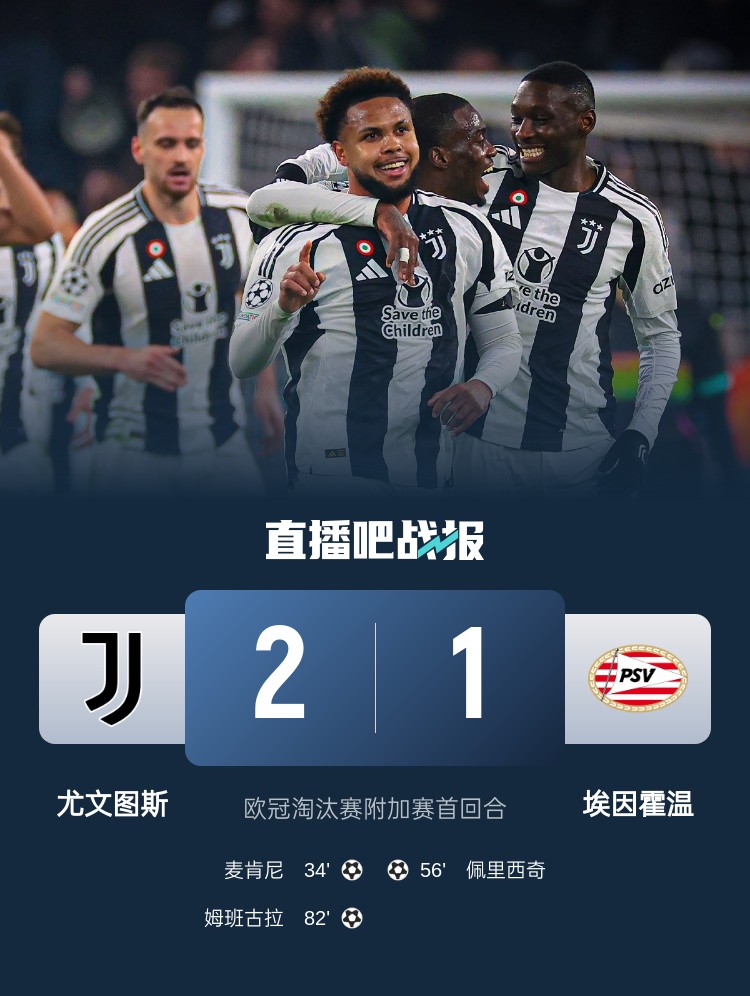 姆班古拉替补制胜,尤文2-1埃因霍温,双方次回合将于2月20日移师埃因霍温主场菲利普球场进行。