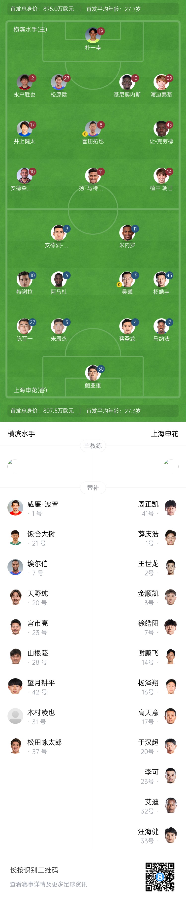 横滨水手首发:19-朴一圭、2-永户胜也、27-松原健、29-杰伊森-基尼奥内斯(F)、39-渡边泰基、8-喜田拓也、17-井上健太、45-让-克劳德(F)、10-安德森-洛佩斯(F)、11-扬-马特乌斯(F)、14-植中朝日